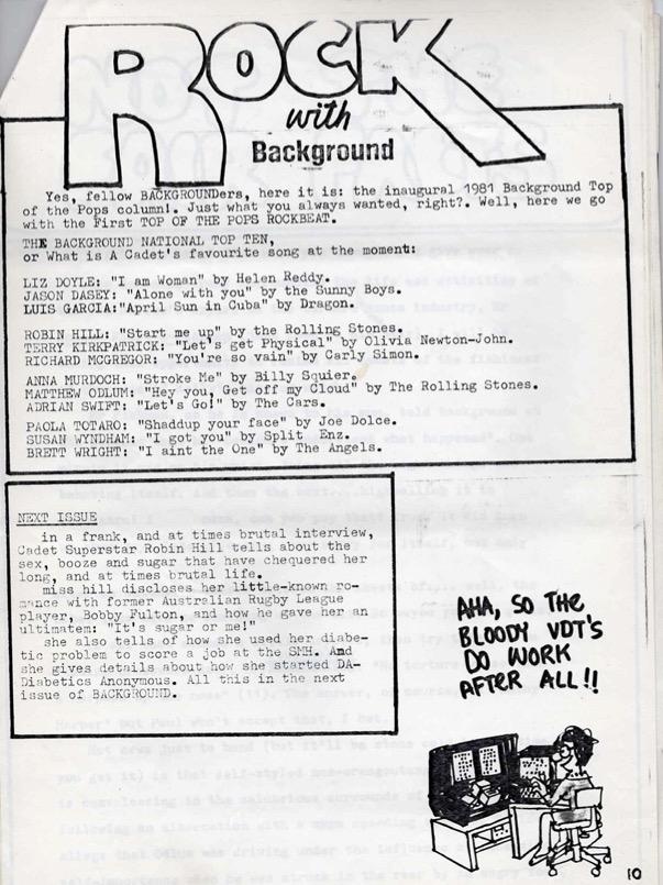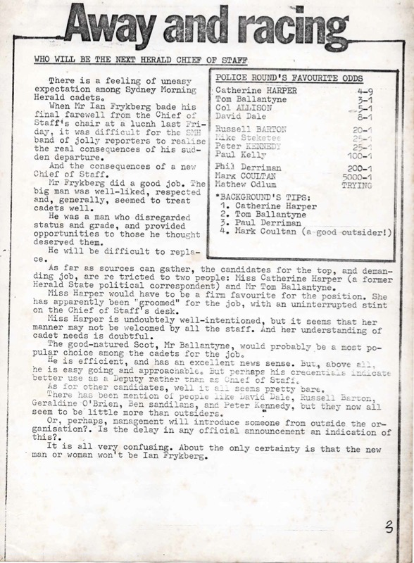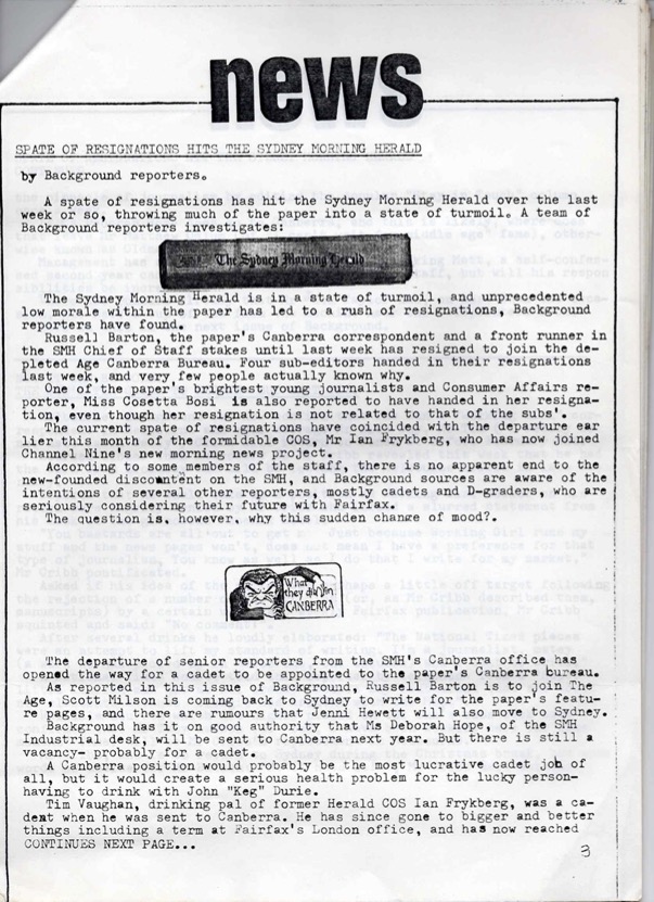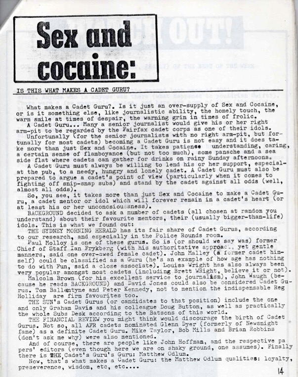 But the urge to write was strong, and so emerged an “underground” newsroom newsletter driven by the cadets. Part fact, part farce, part rumour, each edition of Background was eagerly awaited by journos young and old, but did ruffle some feathers, with the editors being hauled before management after one story. They were allowed to continue publishing, under some “adult” supervision.
