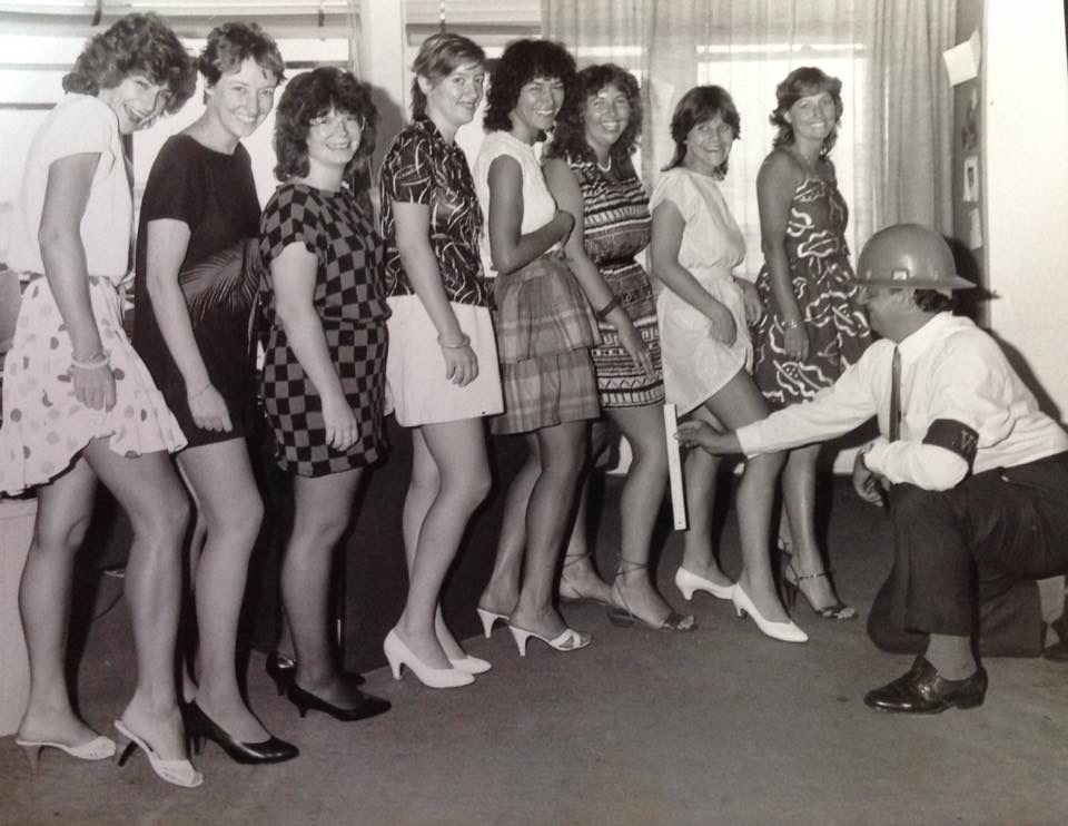 Charles Long, Sun COS, measures the skirts of female staff including cadet Lisa Carty (third from left) in 1981. Lisa can’t remember why this took place, but one thing’s for sure – it would never happen today!